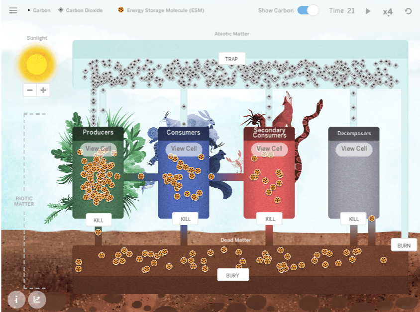 Carbon is moving into and out of living things at the same time.