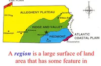 This region covers the greatest area of land: Allegheny Plateau, Erie Lowland, Atlantic Coastal Plain, Ridge and Valley.