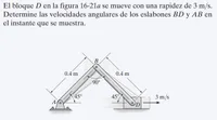 El bloque D en la figura se mueve con una rapidez de 3 m/s. Determine las velocidades angulares de los eslabones BD y AB en el instante que se muestra.