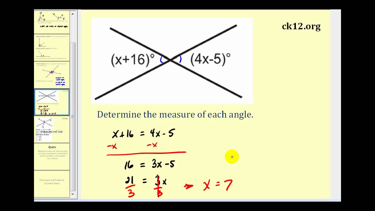 Given two intersecting lines creating vertical angles, if one angle measures x + 16 degrees, what could be the measure of its vertical angle?