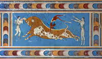 Minoan art has depictions of men in headdresses as well as men and women jumping over the end of a bull. In what way are these depictions similar to each other?