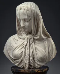 The upper garment of the sculpture fits tightly to the body and appears to be made of a ... fabric.