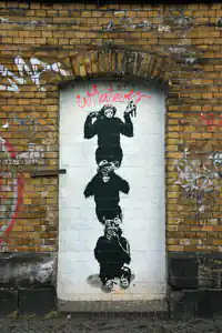 In Banksy's 'Three Monkeys' artwork, what does each monkey represent?