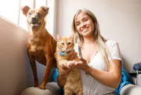 Nosotros tenemos un perro, y ustedes tienen dos gatos. (a) gatos son Manchas (Spots) y Rayas (Stripes).