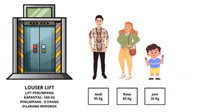 Perhatikan keterangan pada gambar lift di bawah ini! Lift sudah berisi 5 orang dengan jumlah berat badan 380 kg. Diluar Lift Andi, Rosa, dan Joni akan masuk ke dalam lift yang sama. Apabila Andi masuk lift dengan membawa barang seberat 6 kg dan bergabung dengan kelima orang yang ada di dalam lift. Berapa kg kapasitas lift yang tersisa?