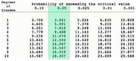 The Critical Value is important - it is all the numbers below the 0.05. We will always use that since it represents 95% confidence. BUT, you will have this chart with you whenever you do a Chi Square test, so you could use other values. If your degree of freedom is 5, what is the critical value we'd use?