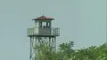 Refugees walking along train track in Hungary