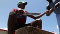 Fishermen gutting a fish on boat