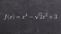 Identify the degree and leading coefficient of the polynomial function F(X) = X^4 - √2X^2 + 3.