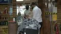 Men having haircuts in a barbers' after lockdown easing