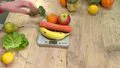 Fruits and vegetables being places on a scale