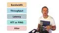 The video tutorial covers essential network parameters: bandwidth, throughput, latency, RTT, and jitter. Bandwidth is a physical layer property measured in bits per second, while throughput is the actual data transfer rate, usually less than bandwidth. Latency involves various delays, and RTT measures the time for data to travel to a point and back. Jitter describes variations in latency, affecting application performance. The tutorial concludes with a transition to discussing Ethernet.
